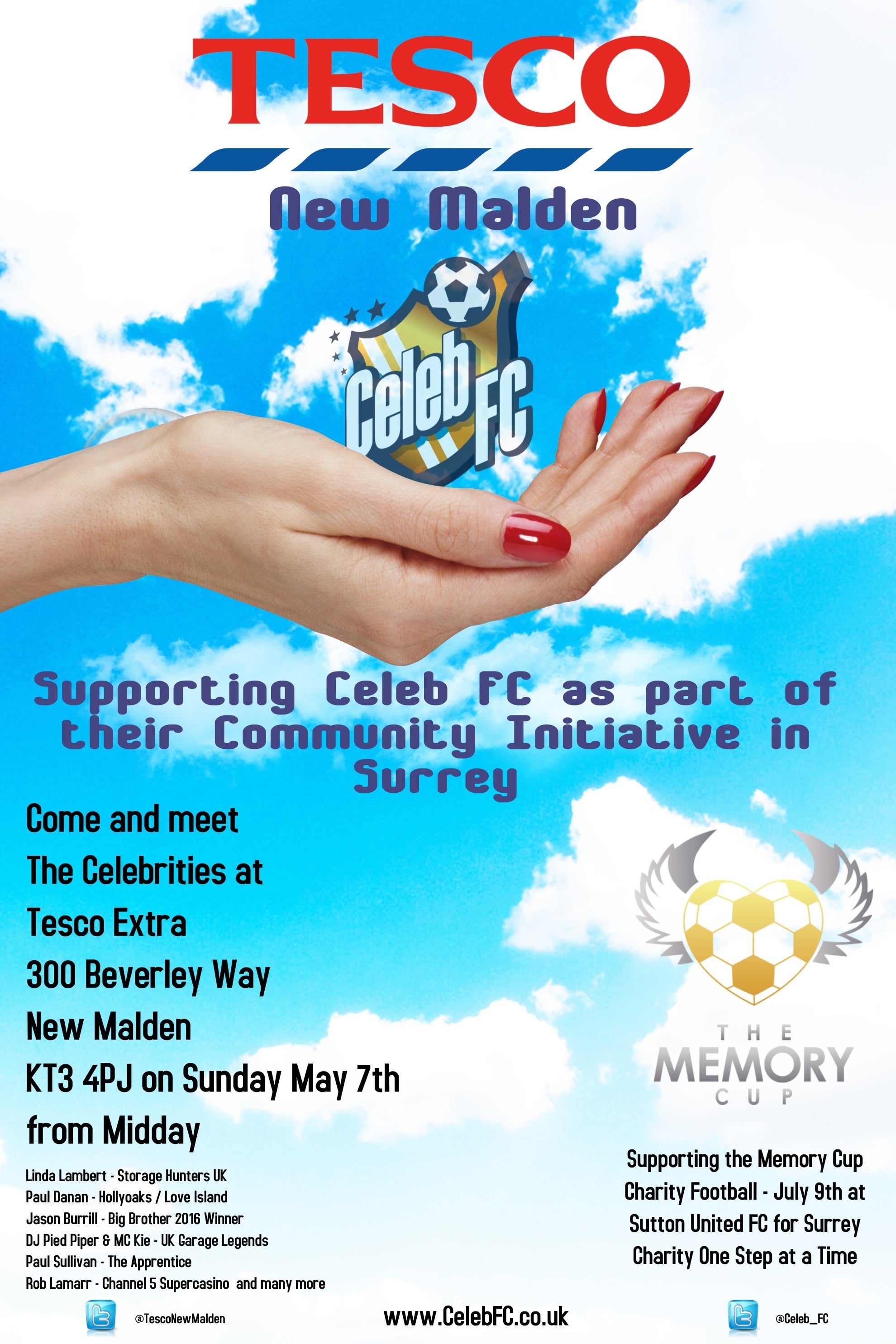 FreeCeleb FC will be in-store at Tesco’s New Malden on the afternoon of Sunday May 7th. We will be with 2 great Surrey charities, The Chris Donovan trust and One Step at a Time. This is happening as we are proud to announce that Tesco are supporting the Memory Cup event on July 9th as part of their “Community Initiative”. Not only will Tesco be supplying Water for players, they are providing other treats and special items which the event will be very grateful of. Tesco Community initiative is all about supporting the Local community and Celeb FC & Tesco are working together to make sure the Memory Cup event is a spectacular success and the wonderful Charity “ONE STEP AT A TIME” in Surrey gets as much support as it possibly can. lease come along, find out about us, The small charities we support and how TESCO are supporting the smaller charities and community initiatives in Surrey…